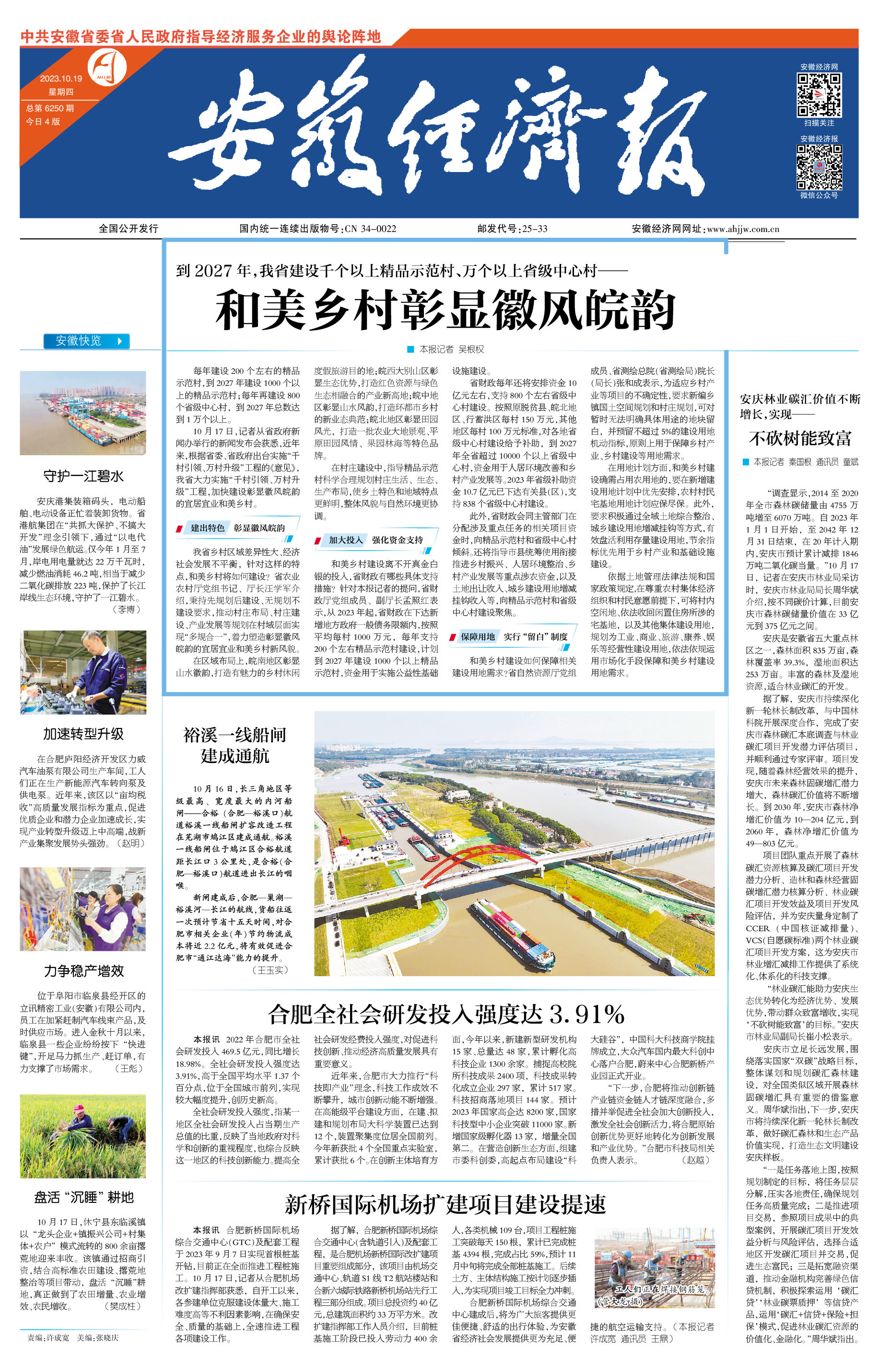 10月17日,记者从省政府新闻办举行的新闻发布会获悉,近年来,根据省委、省政府出台实施“千村引领、万村升级”工程的《意见》,我省大力实施“千村引领、万村升级”工程,加快建设彰显徽风皖韵的宜居宜业和美乡村。