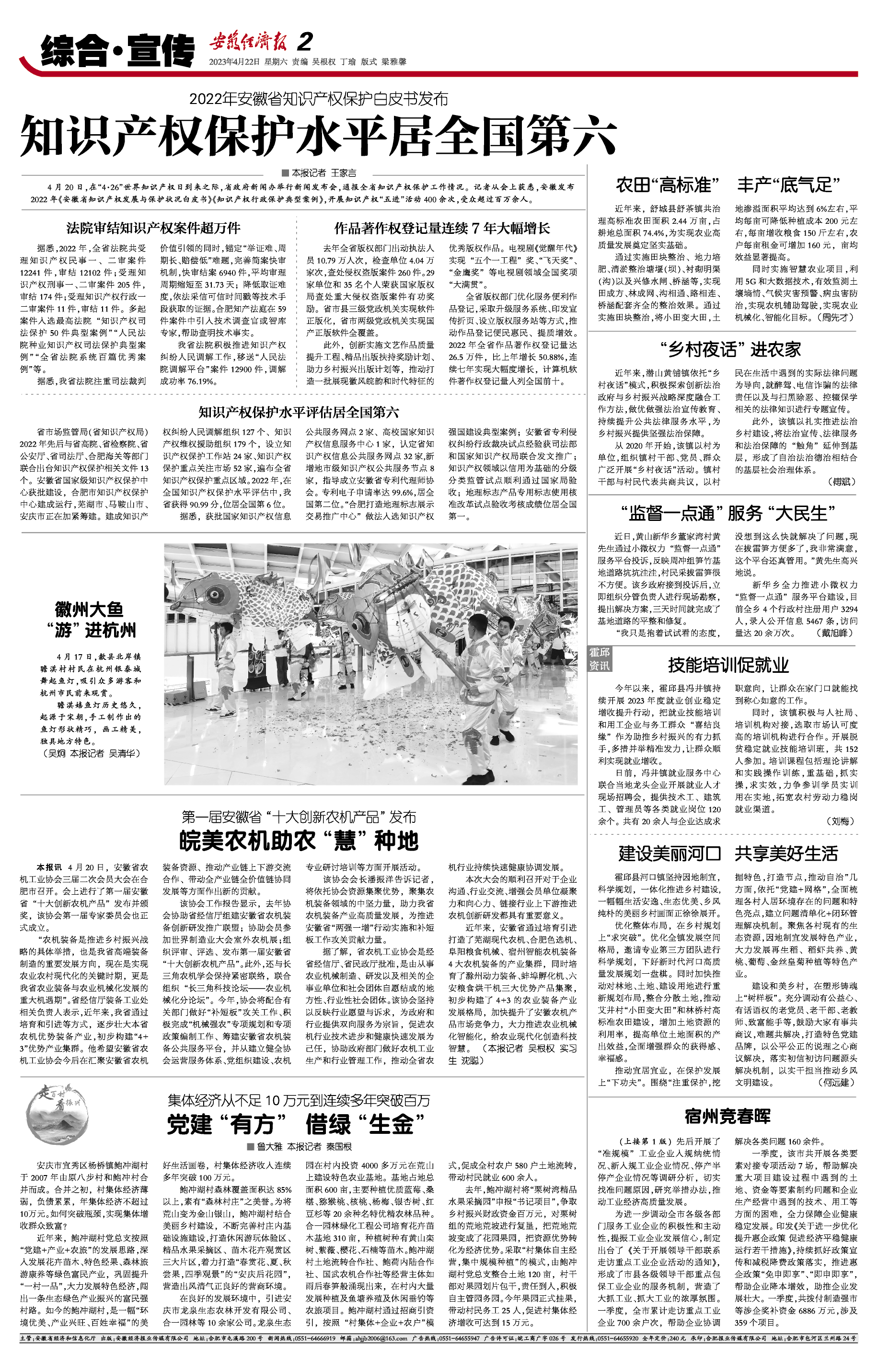 4月20日,在“4·26”世界知识产权日到来之际,省政府新闻办举行新闻发布会,通报全省知识产权保护工作情况。记者从会上获悉,安徽发布2022年《安徽省知识产权发展与保护状况白皮书》《知识产权行政保护典型案例》,开展知识产权“五进”活动400余次,受众超过百万余人。