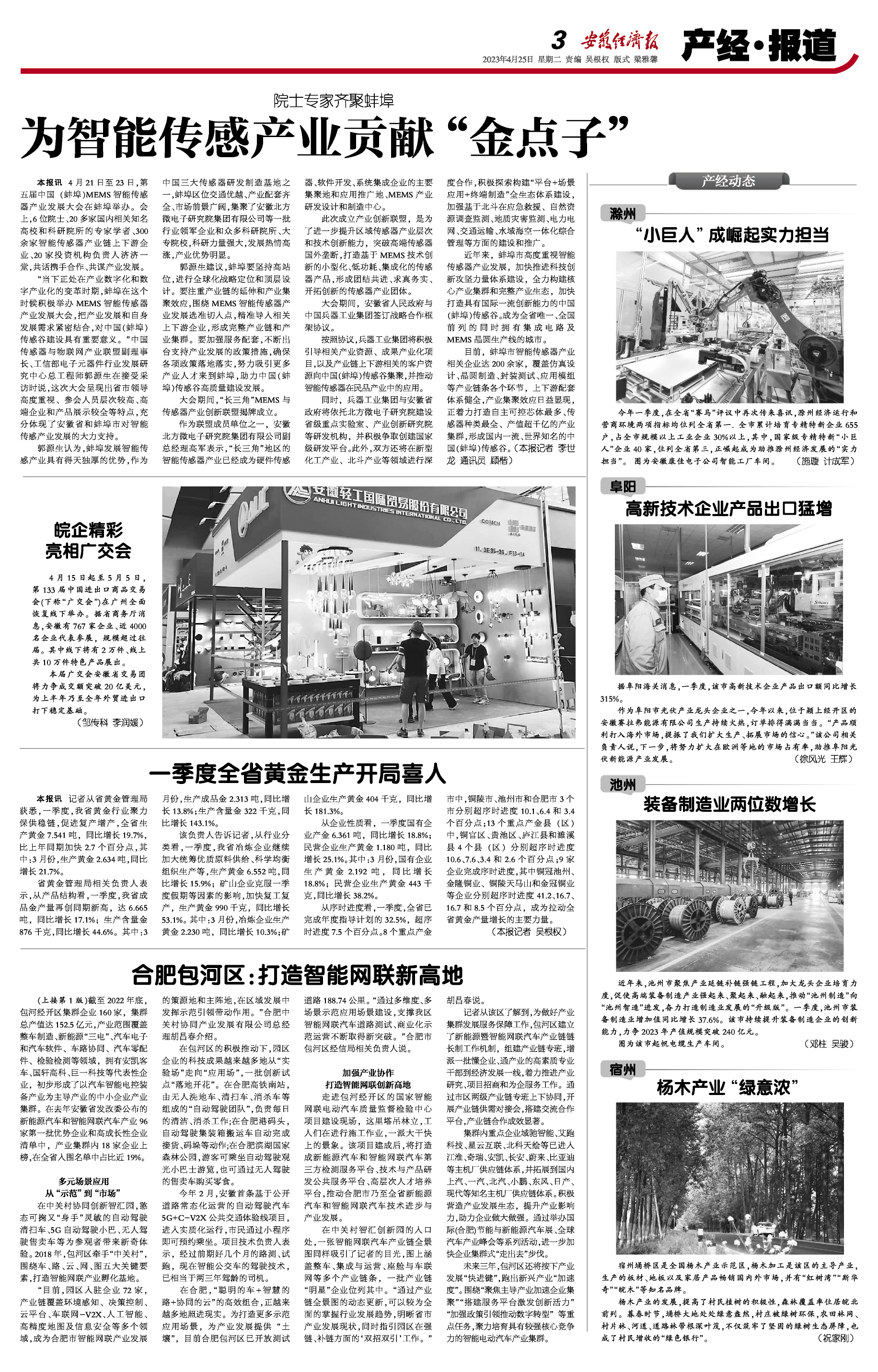 目前,蚌埠市智能传感器产业相关企业达200余家,覆盖仿真设计、晶圆制造、封装测试、应用模组等产业链条各个环节,上下游配套体系健全,产业集聚效应日益显现,正着力打造自主可控芯体最多、传感器种类最全、产值超千亿的产业集群,形成国内一流、世界知名的中国(蚌埠)传感谷。