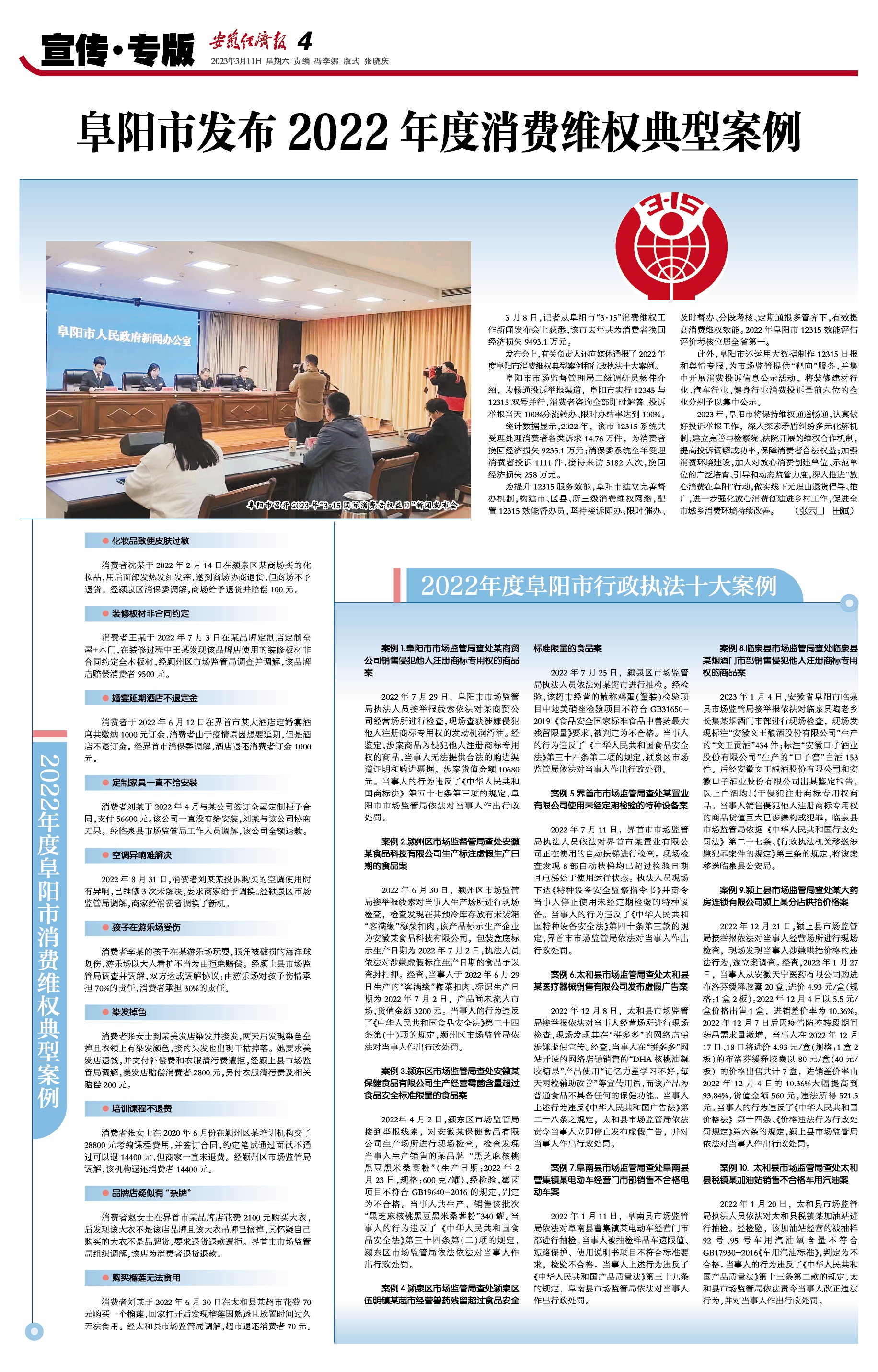 发布会上,有关负责人还向媒体通报了2022年度阜阳市消费维权典型案例和行政执法十大案例。