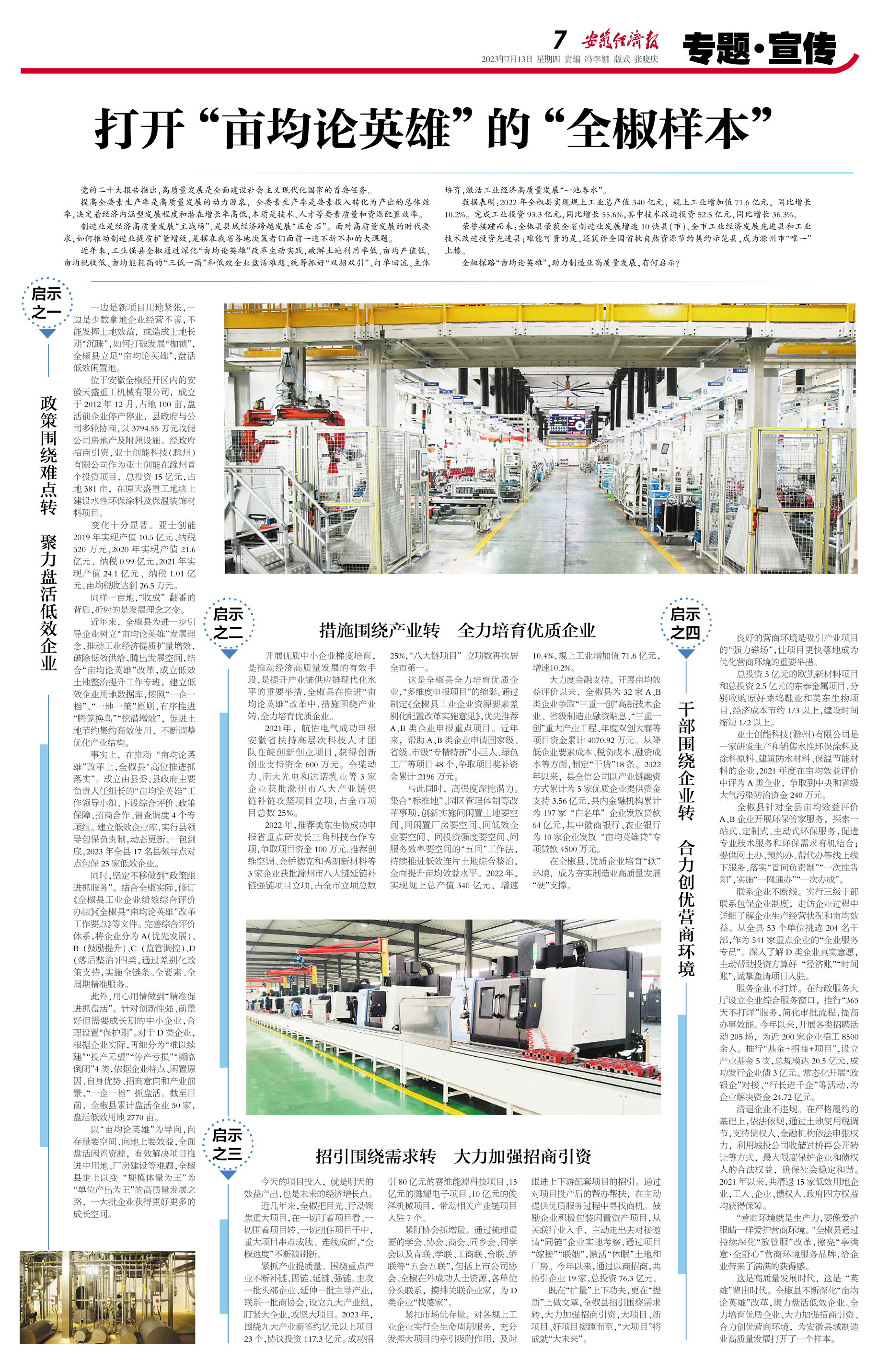 这是高质量发展时代,这是“英雄”辈出时代。全椒县不断深化“亩均论英雄”改革,聚力盘活低效企业、全力培育优质企业、大力加强招商引资、合力创优营商环境,为安徽县域制造业高质量发展打开了一个样本。