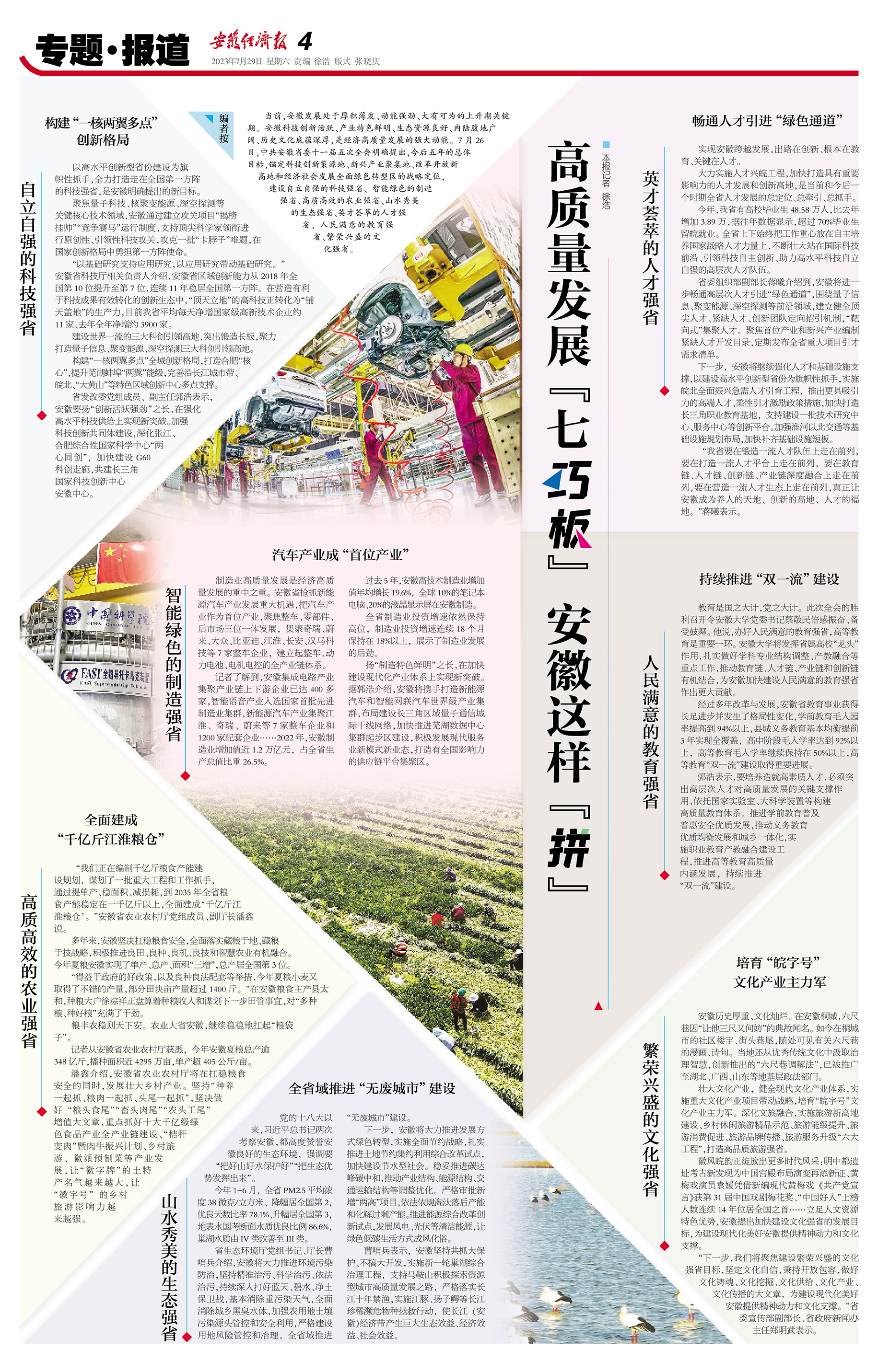 编者按 当前,安徽发展处于厚积薄发、动能强劲、大有可为的上升期关键期。安徽科技创新活跃、产业特色鲜明、生态资源良好、内陆腹地广阔、历史文化底蕴深厚,是经济高质量发展的强大动能。7月26日,****安徽省委十一届五次全会明确提出,今后五年的总体目标,锚定科技创新策源地、新兴产业聚集地、改革开放新高地和经济社会发展全面绿色转型区的战略定位,建设自立自强的科技强省、智能绿色的制造强省、高质高效的农业强省、山水秀美的生态强省、英才荟萃的人才强省、人民满意的教育强省、繁荣兴盛的文化强省。